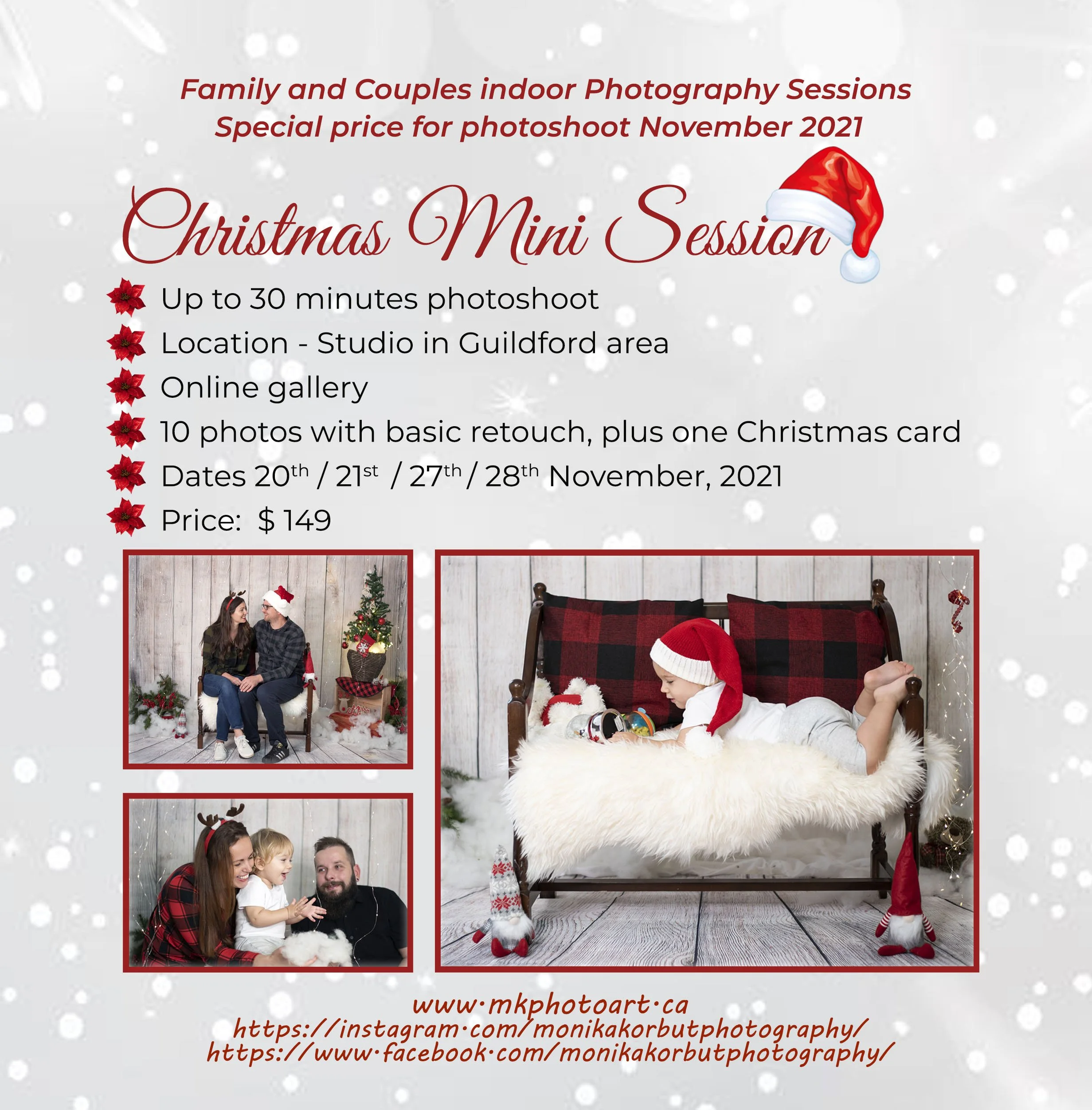 Our package includes a 30 minute photography session in an elegant Christmas-theme studio space with photos available within 5 days after the shoot.