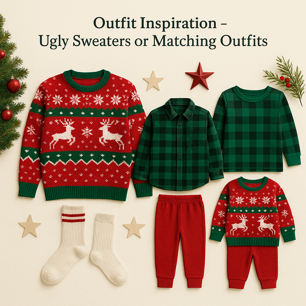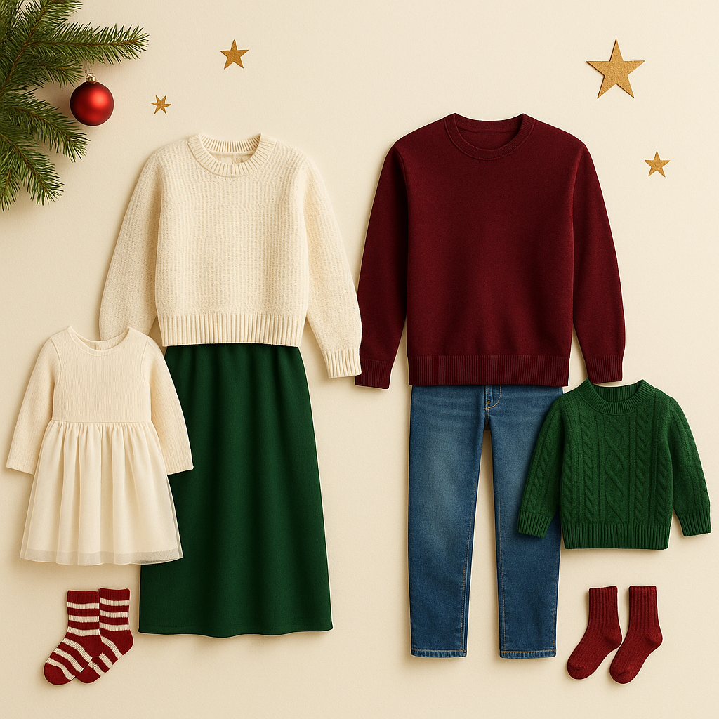 Please avoid neon tones, large logos, or overly busy patterns so the focus stays on your family and the holiday ambiance.